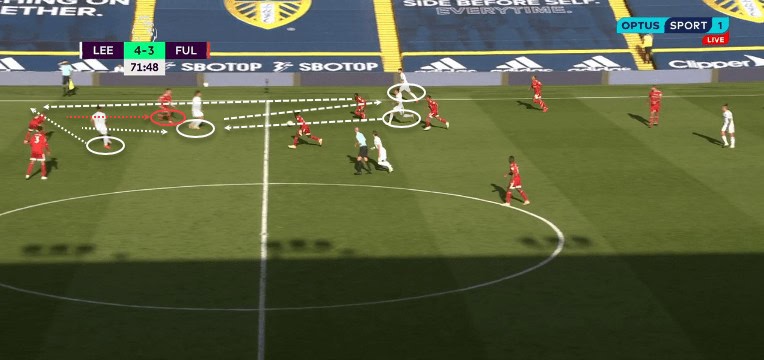 تصویر زیر نشان میدهد که لیدز این عمل تاکتیکی فوتبال را در یک سوم میانی انجام میدهد و توپ را پشت مدافع کناری جمعآوری میکند.