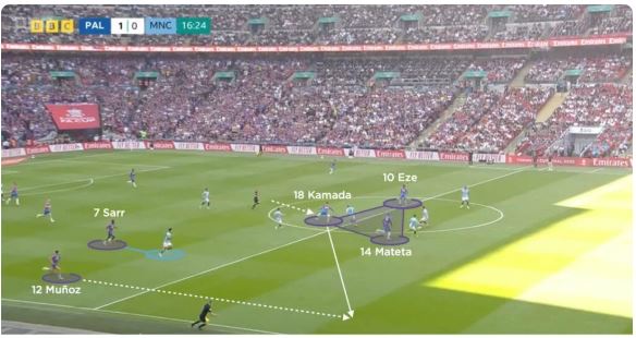 اگرچه حملات پالاس کم بود، اما توانایی آنها در اتصال و پیشروی مونیوز به موقعیتهای سانتر، تهدیدی کافی برای آنها ایجاد کرد. عقبنشینی سار به مونیوز در هنگام تغییر بازی یا از توپهای مرده مانند پرتابهای اوت کمک کرد. دویدن رو به جلوی ایزه و ماتا، خط دفاعی سیتی را عقبتر برد و سار حرکات خود را در جهت مخالف برای دریافت توپ از خط میانی سیتی زمانبندی کرد. از آنجا، مونیوز به سمت بیرون زمین حمله کرد و به دنبال دویدن به پشت سر اوریلی (تصویر بالا) بود که در حال بازیابی توپ بود.