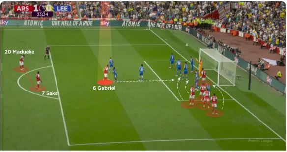 اگر گابریل تماس اصلی نباشد، می‌تواند به هم‌تیمی‌هایش در موقعیت‌های گلزنی قوی در تیرک عقب کمک کند. اگر حریف در اولین برخورد پیروز شود، به دلیل سطح بالای اختلال آرسنال، هرگونه تلاش برای دفع توپ می‌تواند فاقد ارتفاع و/یا فاصله باشد. بازیکنان آرسنال که در لبه محوطه جریمه قفل می‌شوند، می‌توانند مرحله بعدی را تضمین کنند، که منجر به گل‌های فوق‌العاده‌ای برای توپچی‌ها شده است.