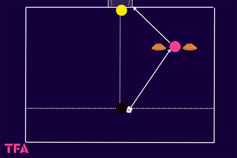 سپس آنها باید یک شوت به سمت دروازه داشته باشند یا توپ را به یک مینی گل یا منطقه ای که خارج از مخروط در محوطه مشخص شده است، ارسال کنند.
