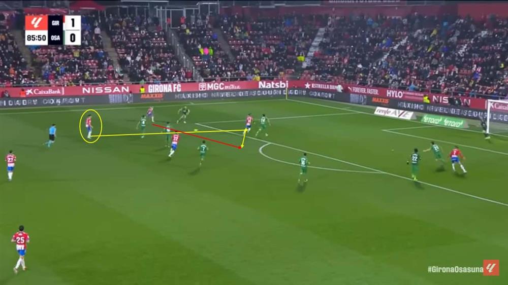 سپس ساویو به سرعت در فضای پشت مدافع کناری منفجر می شود، جایی که او می تواند در انتهای توپ عبور کند و برای اولین بار سانتر بزند و یک موقعیت گل برای تیمش ایجاد کند.
