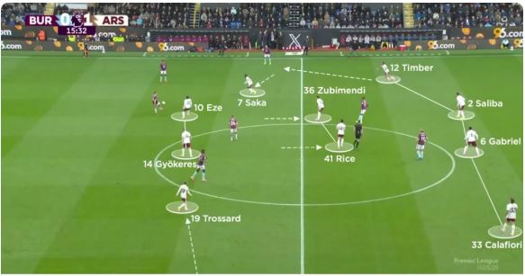 با توجه به اینکه رایس عمدتاً در سمت چپ دابل پیوت در کنار مارتین زوبیمندی مستقر است، حرکات رو به جلوی او به طور طبیعی کانال داخلی چپ را هدف قرار می‌دهد. از اینجا، ازه اجازه حمله یا حرکت به کانال داخلی راست را دارد، جایی که او به خوبی با بوکایو ساکا، وینگر راست و یوریان تیمبر، مدافع راست پیشروی کننده، همکاری کرده است. زوبیمندی، به عنوان رابط پاس‌های عمقی، به لطف توانایی‌اش در شکستن خطوط با پاس‌هایش (تصویر بالا)، این بازیکنان پیشرفته را پیدا کرده است.